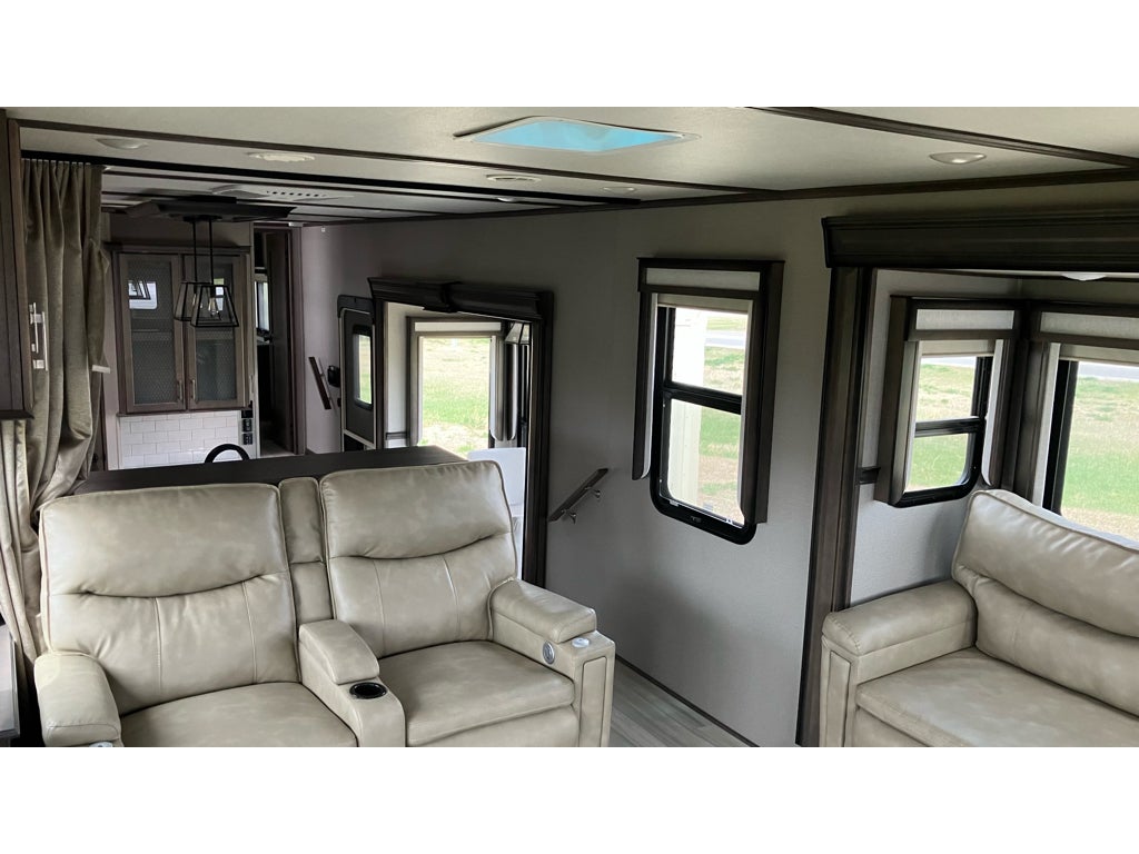 The 375RES is built around a rear entertainment floor plan, which means the living area sits at the back with big windows and room to spread out, while the private master bedroom is tucked up front away from the action. With five slideouts, this rig opens up into a space that feels more like a cabin than a camper. It sleeps up to six people comfortably.