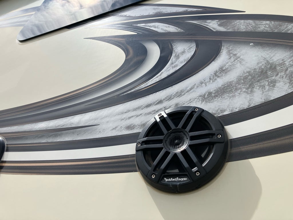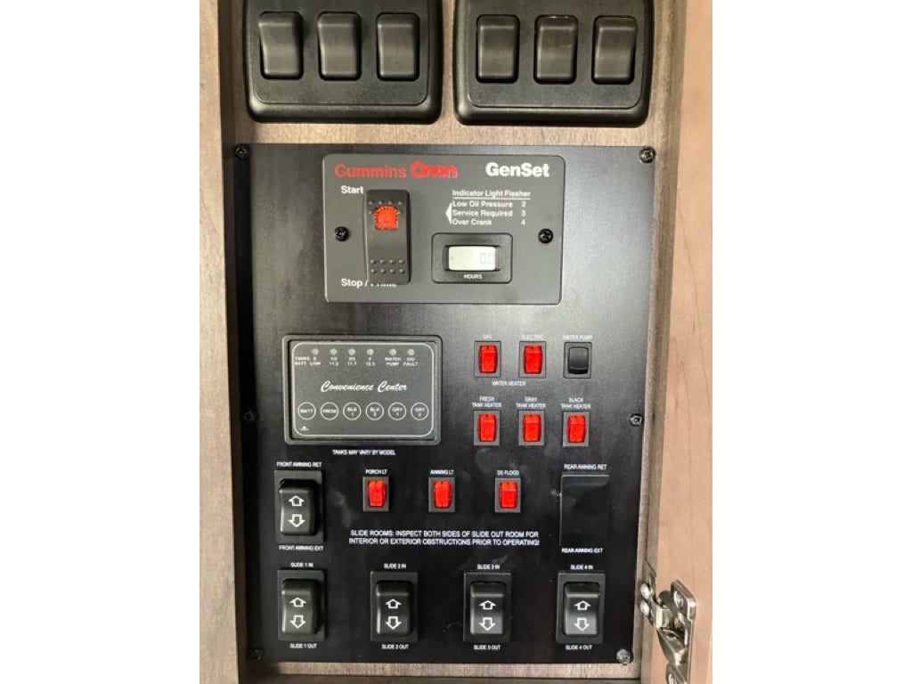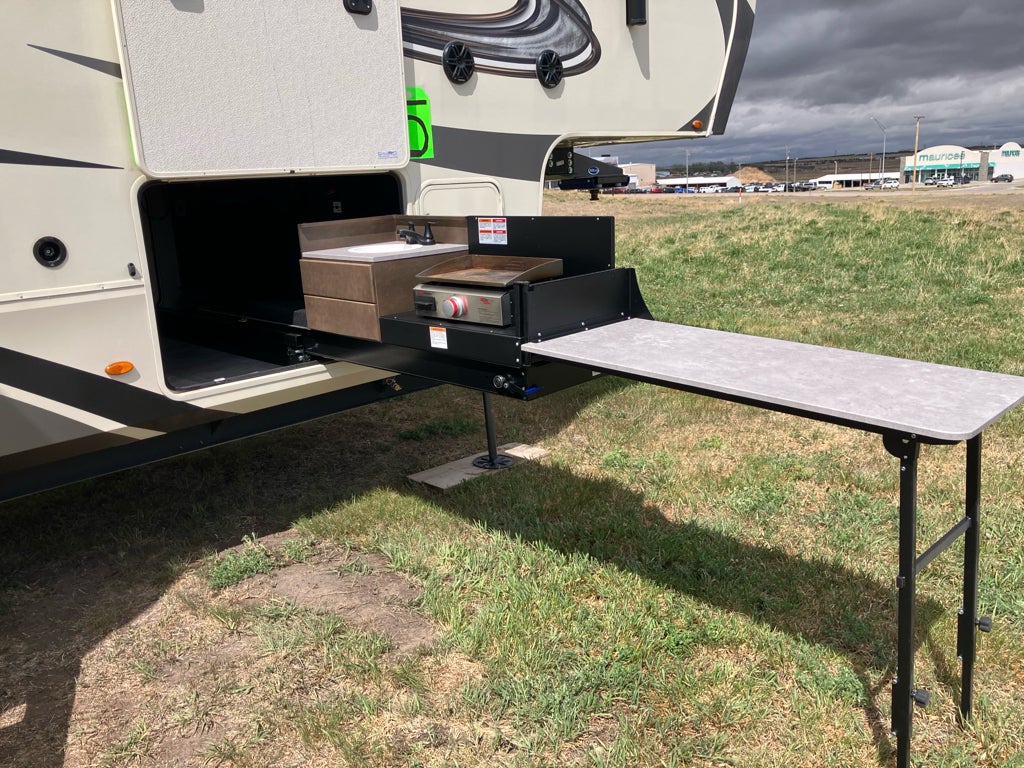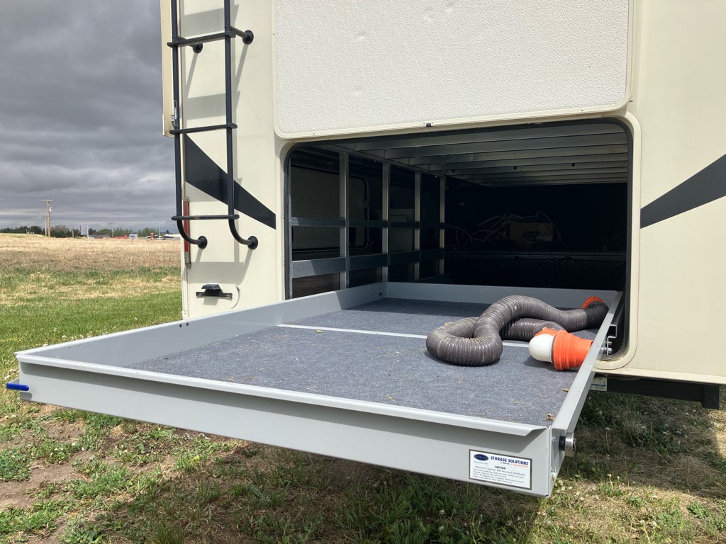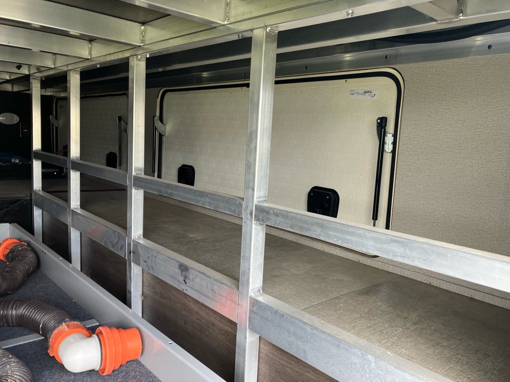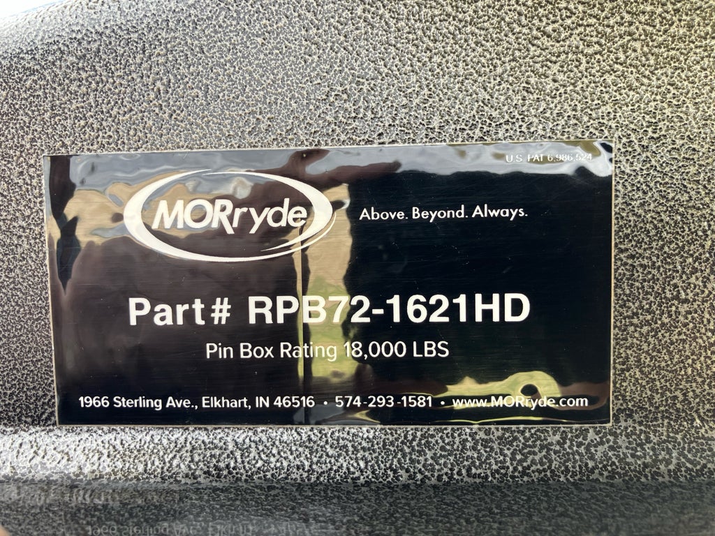 This rig also comes loaded with practical upgrades. The 6-point hydraulic auto-leveling system takes the hassle out of getting set up at camp. A premium MORryde suspension system makes towing smoother. You get dual air conditioners, an exterior sliding storage tray, a massive pass-through basement for gear, central vacuum, LED lighting, and preps for solar, an inverter, and a washer/dryer.